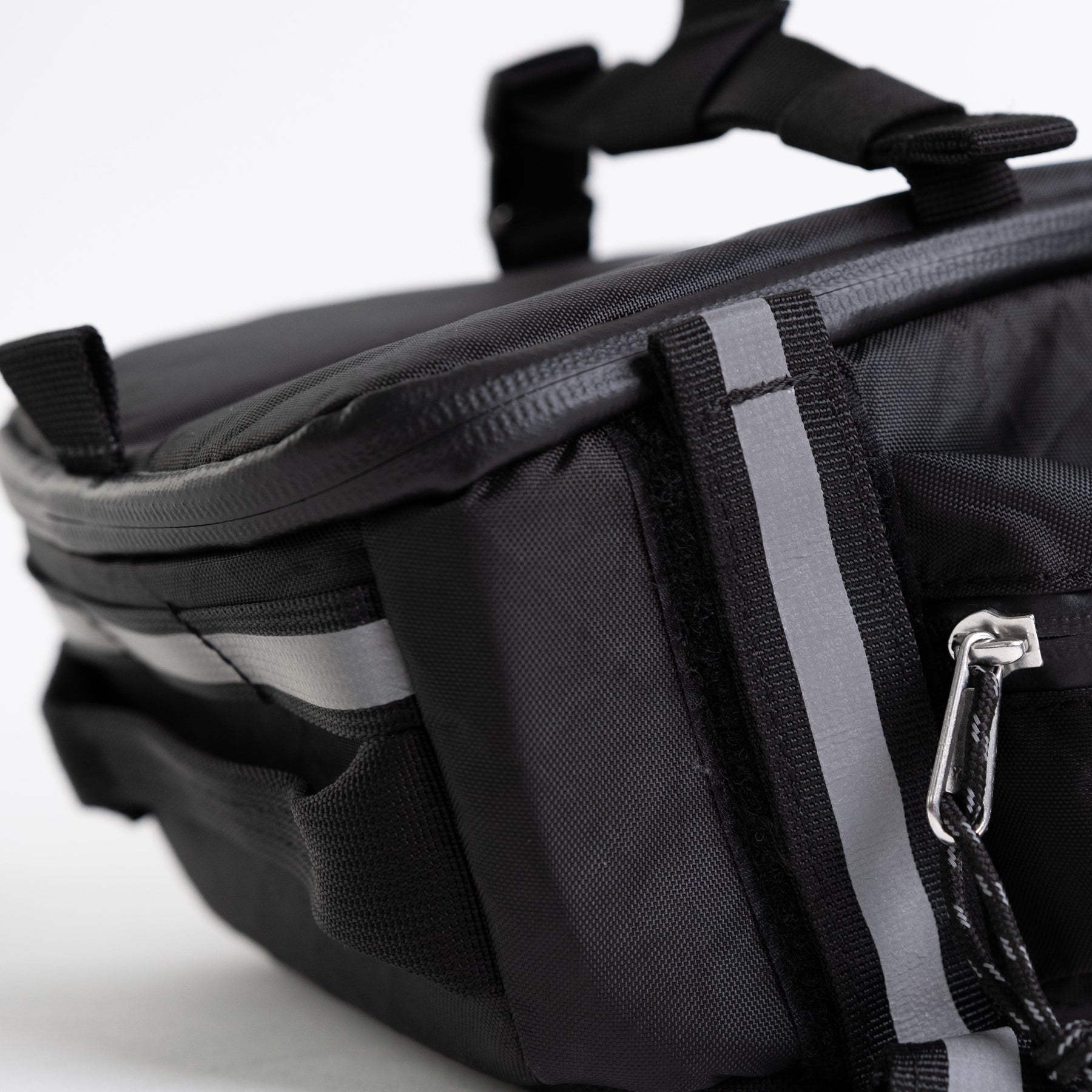 The TailRider 2 trunk bag is perfect for commuters, recreational and touring cyclists who need reliable rear storage. This 11L bag features a spacious main compartment with expansion capabilities, 3 exterior pockets for organization, and reflective details for safety. The quick-release velcro mounting system works with most rear racks, making it easy to take on and off. Available in durable Ecopak recycled fabric in Black Knight, Wolf Grey, or Lime colors, it's ideal for carrying gear for day trips or quick access essentials on your long touring trip.